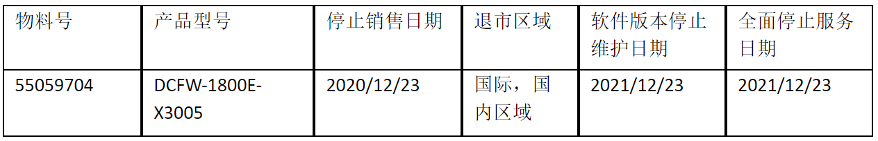 北京神州数码快盈VIII信息技术有限公司正式通知您, 以上DCFW-1800E-X3005下一代防火墙(55059704)将于2020年12月23号停止接收新的订单(具体日期见上表),不再供货。给您带来的不便,敬请原谅。